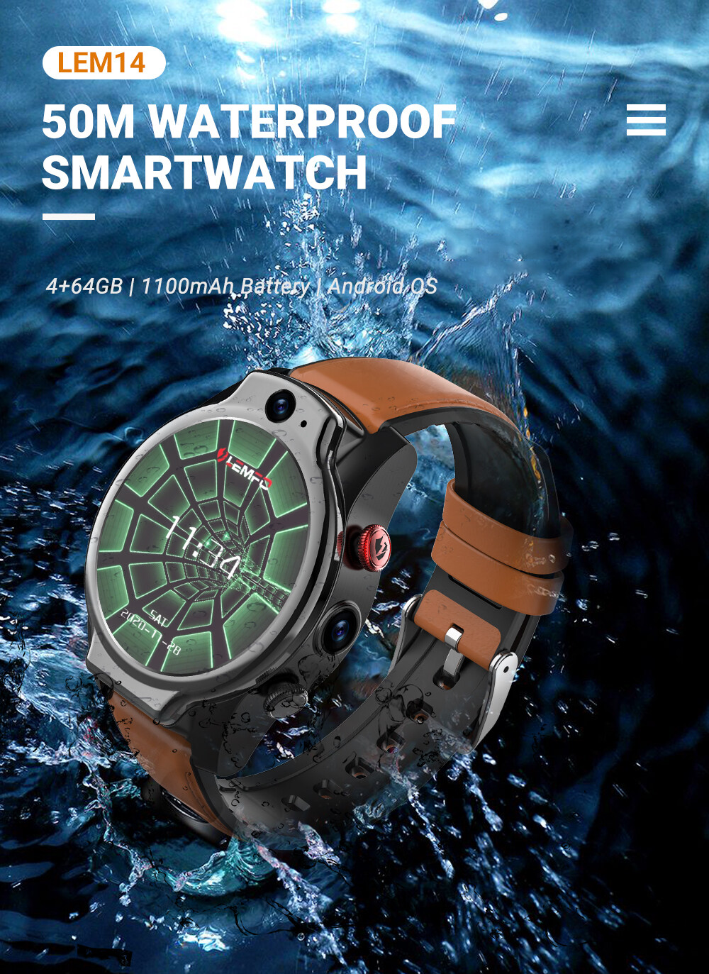 LEMFO LEM14 Smart Watch 4G 5ATM Waterproof Android 10 Helio P22 Chip 4G 64GB Face ID Dual Camera